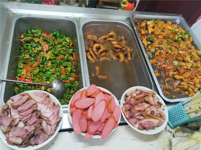 職工們發(fā)現(xiàn),車隊(duì)的職工食堂今天的伙食比往常額外增加了“硬菜”,有豬頭肉,香腸、熘肉段,醬雞脖、青椒炒雞蛋等菜品,職工們第一時(shí)間吃上醬香的豬頭肉,特別高興。