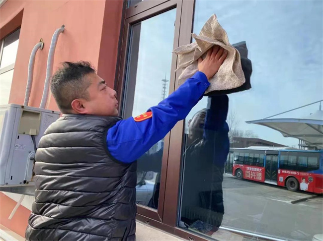 帶班隊長及黨員駕駛員王鳳岐、蘇野拿起工具,對駕駛員休息室、站區(qū)欄桿等衛(wèi)生進行清潔