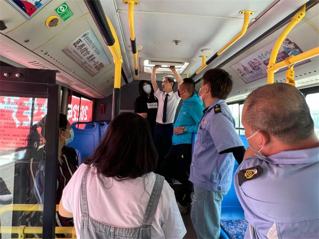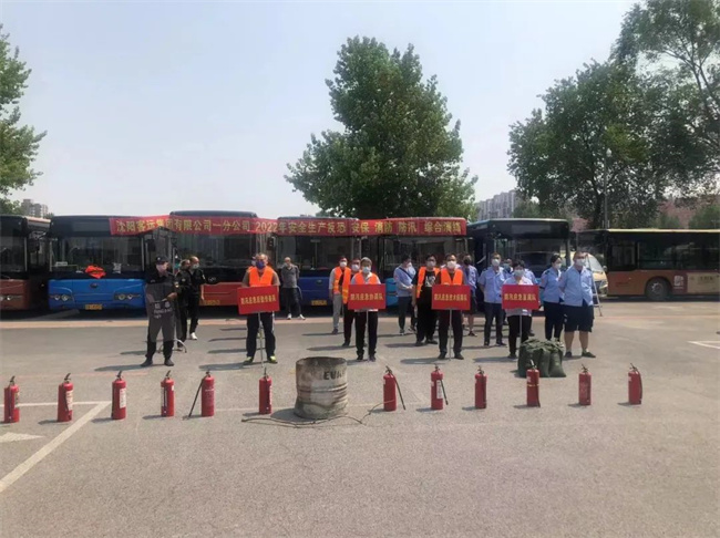 會后,在公司院內(nèi)進行實地演練,模擬公交車輛突發(fā)火災時,駕駛員在應急情況下緊急停車,疏散乘客,正確使用滅火器進行滅火等內(nèi)容。