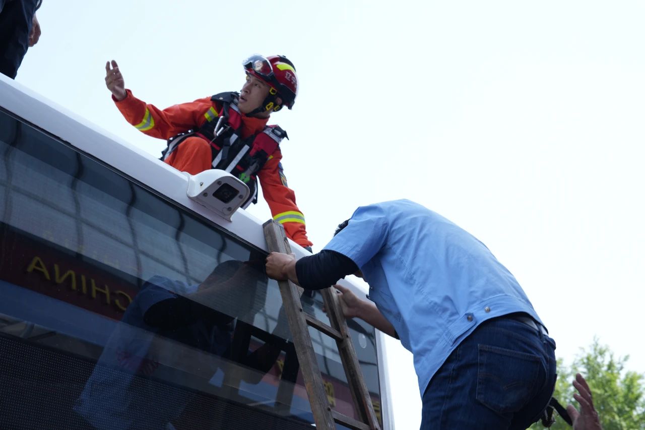 演練模擬了公交運營中多種突發(fā)場景,包括車輛火災(zāi)撲救、乘客攜帶危險品處置、積水路段熄火應(yīng)對以及車輛遇險(進水、被困)時緊急停車、使用滅火器/安全錘破窗、疏散逃生等。