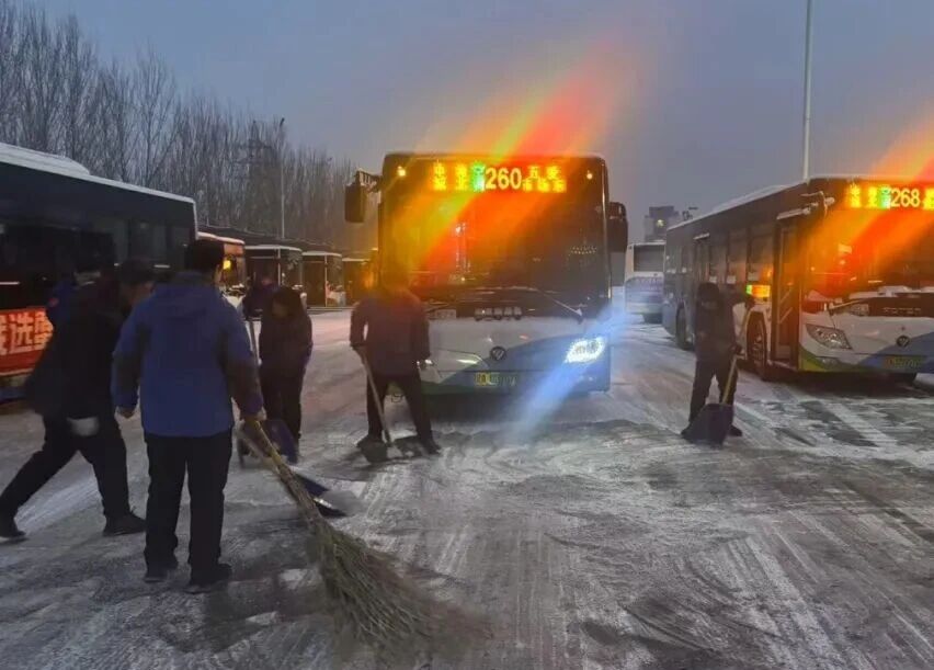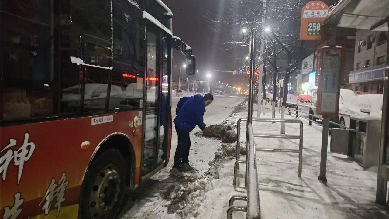 天色未亮,各車隊(duì)的管理人員與駕駛員已提前到崗。他們手持除雪鏟、掃帚等工具,默契配合,全力清掃公交場(chǎng)區(qū)、車輛及站臺(tái)積雪,為公交車輛安全進(jìn)出場(chǎng)、乘客安全候車掃清障礙。在確保場(chǎng)站暢通的同時(shí),出車前的安全叮囑準(zhǔn)時(shí)在各車隊(duì)響起:“注意觀察路況,控制車速,保持車距……”一句句樸實(shí)而鄭重的提醒,凝聚著公交人對(duì)安全行車的高度重視和對(duì)乘客的深切責(zé)任。