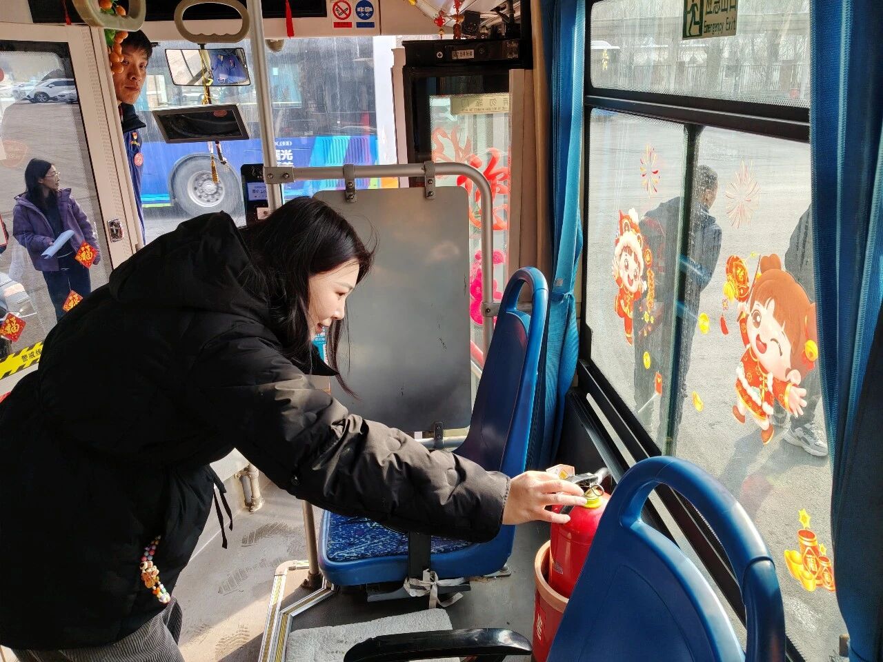 各車隊(duì)還在車廂內(nèi)懸掛紅燈籠、窗花等傳統(tǒng)裝飾。特別是271路駕駛員、書畫愛好者唐德忠揮毫?xí)鴮憽案!弊峙c春聯(lián),筆墨飄香之間,車廂內(nèi)外洋溢著濃濃年味,也傳遞著公交人對乘客真摯的新春祝福。