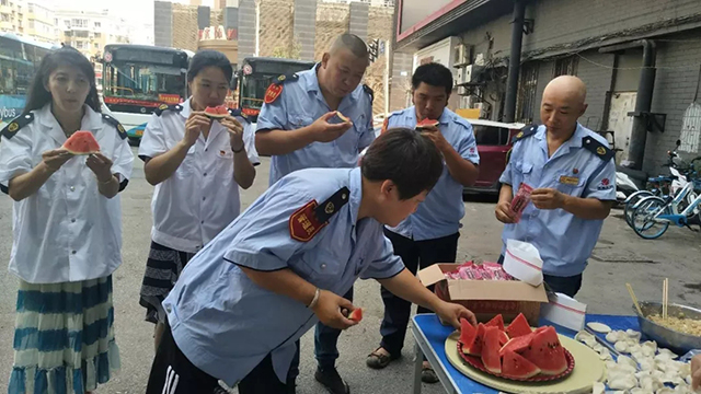 頭伏第一天雖炎熱,但各車隊(duì)都在努力為一線職工改善伙食,提供防暑降溫的礦泉水、綠豆水、西瓜等,不僅使大家開胃降溫,又增進(jìn)了干部職工間的交流,進(jìn)一步營造了車隊(duì)“一家親”的和諧氛圍。