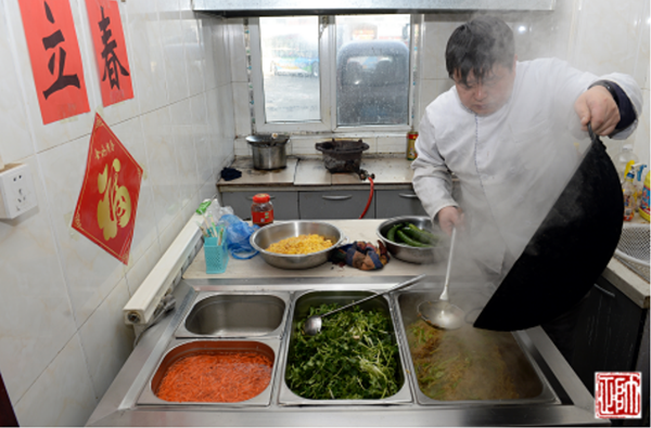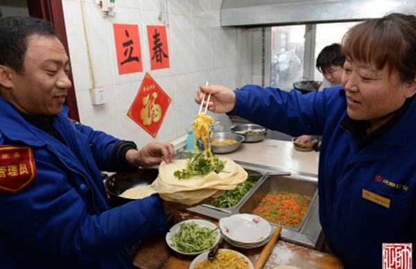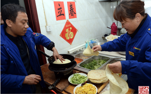 “哎呦,今天烙春餅啦!難怪老遠(yuǎn)兒就聞見了香味兒。快,給我先來兩張!”2月3日大年初七,是節(jié)后的第一個(gè)工作日,恰逢立春。11時(shí)左右,211路駕駛員張智剛跑完一圈兒回到大北門終點(diǎn)站,就被食堂的飯香吸引過去。