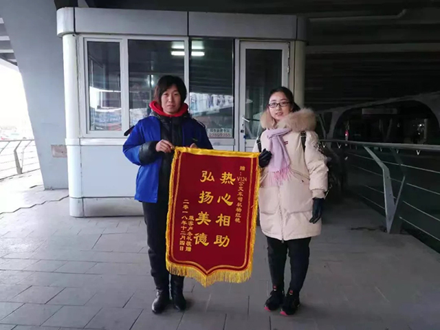 次日,盧女士懷著激動的心情,手里捧著錦旗來到龍之夢終點站,親自將錦旗交給了楊紅艷手中并合影留念。